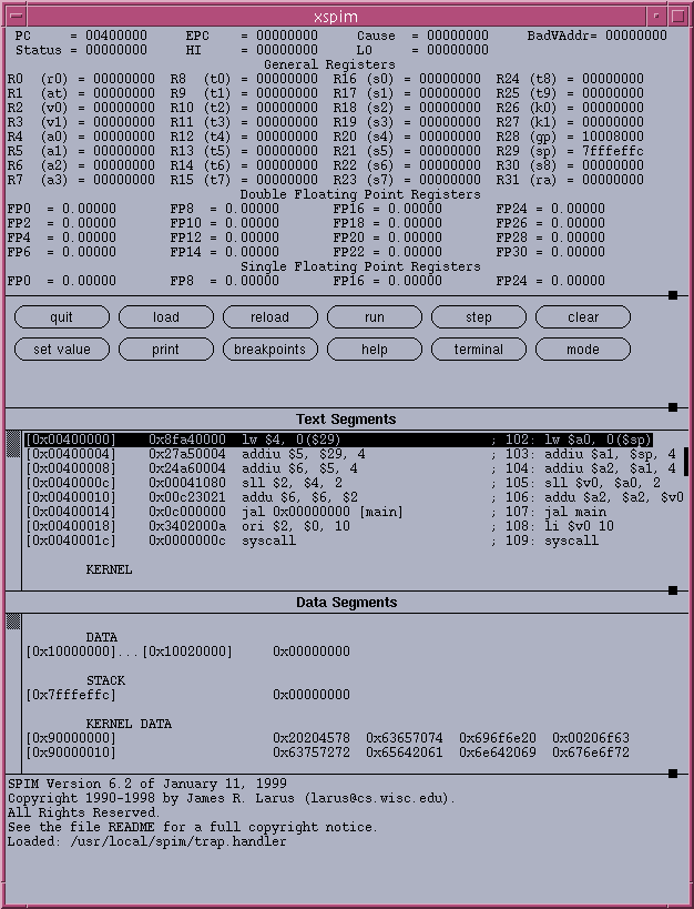 Log into the undergraduate network and type xspim at the shell prompt. The spim environment will be launched and you will see a window with these parts: registers section, control buttons, code segment, data segment, and messages window (the console will appear when the simulation is running).