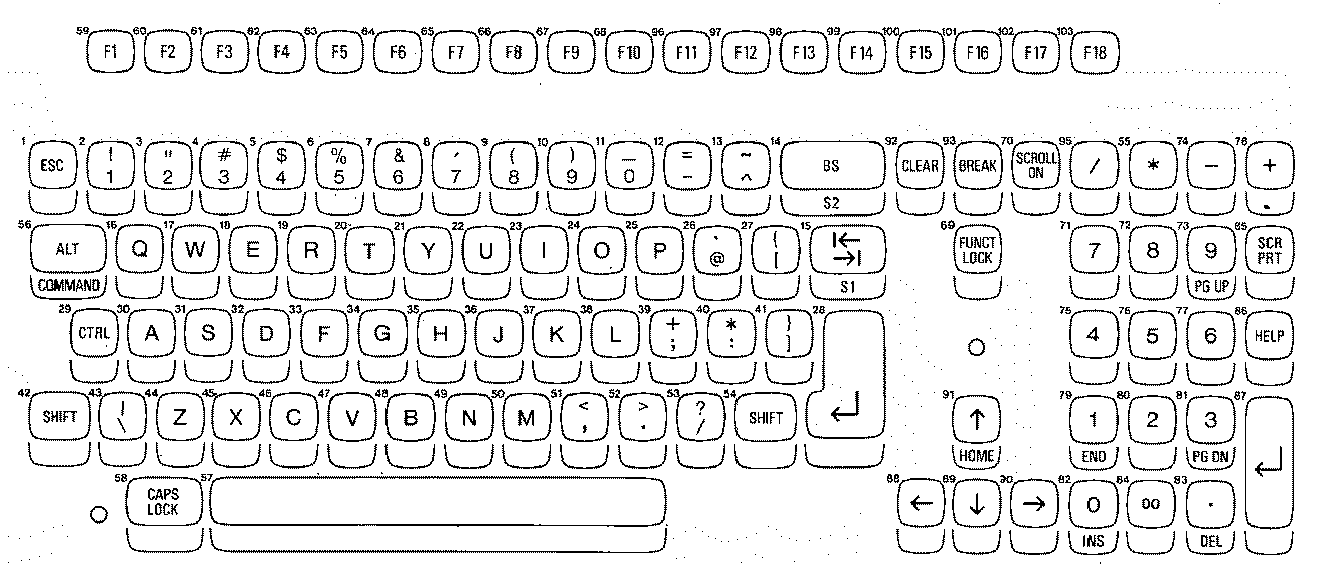 Attached the diagram of the 'deluxe' keyboard, which shows its scancodes in decimal.