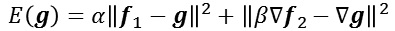 - Smoothing/Sharpening/High-Low Compositing: Given input low- and high-frequency images, a gradient modulation term, and a pixel fidelity term, our code outputs the best-fit image whose gradients match the modulated gradients of the high-frequency input image and whose pixel values match the pixel values of the input low-frequency image. Formally, if f1 is the low-frequency image, f2 is the high-frequency image, α is the low-frequency fidelity term, and β is the gradient modulation term, the output image G is the image minimizing the energy: